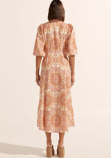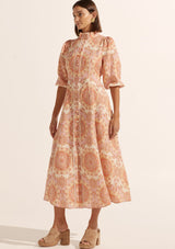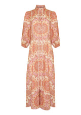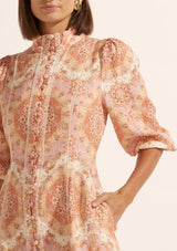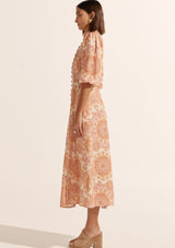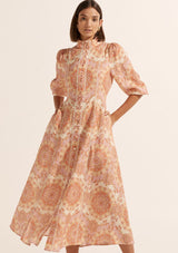The Calibre Dress from Zoe Kratzmann features high stand neckline, centre front button opening, 3/4 length blouson sleeves and side pockets. This flattering dress features vertical panelling and scalloped lace trim for an elongating effect. Crafted in sunset mosaic, a signature print that showcases a spectrum of foamy, soothing hues whilst evoking the magic of an ancient city at dusk.