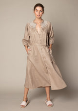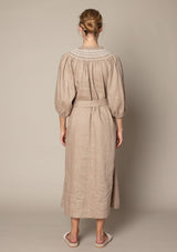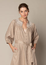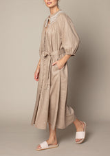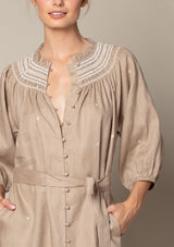 The Cape Dress from Zoe Kratzmann features an open tab neckline, blouson sleeve, delicate covered front centre buttons and a self tie belt to cinch in the waistline. Elevated detail such as embroidery and smocked trim create a feminine style. It blends a chic polished look with a free-spirited feel making it the ideal choice for everyday wear.
