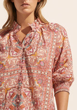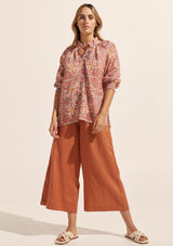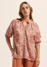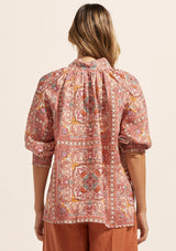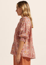 The Carousel Top from Zoe Kratzmann features a stand collar, button through opening and 3/4 length sleeves with shirred cuffs. Crafted in natural ramie fabric with a signature print, this style will ensure a well-dressed yet luxe vibe whatever the occasion.