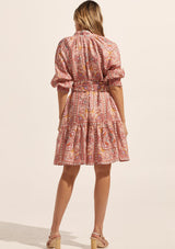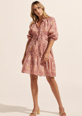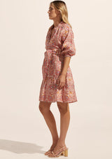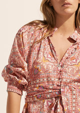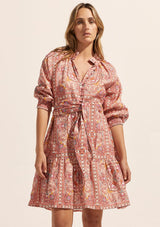 The Cater Dress from Zoe Kratzmann features a high stand collar, button through opening finishing below the bust, blouson style raglan sleeves with shirred cuffs, a deep ruffled hemline and a removable wide self-tie fabric belt. Crafted in a luxurious lightweight linen in the signature Rio Scarf print. A myriad of vibrant hues that take inspiration from neo-classical tile designs. This dress feels both energised and vibrant, creating a piece that is both statement yet feminine.