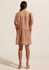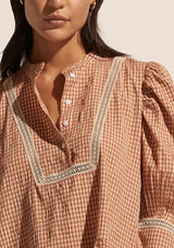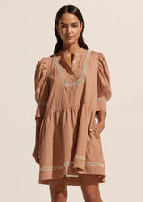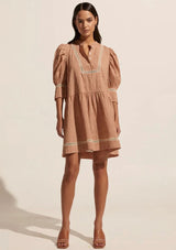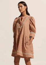 The Charter Dress from Zoe Kratzmann features a tab neckline with button through opening, drop waist, side pockets, ¾ blouson sleeves with cuffs and lace trim detail for a feminine finish. Crafted from a soft seersucker fabrication, this easy-fitting and effortless dress will carry you from work to weekend with ease.