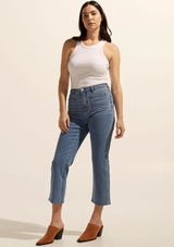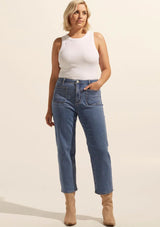The College Jean from Zoe Kratzmann features a mid-rise, zipper, belt loops, functional front and back patch pockets and a cropped straight leg silhouette. Crafted in soft quality denim with infused stretch, this jean will become your new go-to for the season.