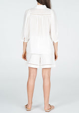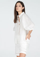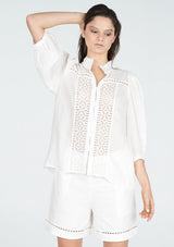 The Croft Top from Zoe Kraztmann is crafted from 100% Ramie, a lightweight non-stretch fabrication. This soft feminine shirt features a notch style neckline, blouson sleeve and lace detailing down the front panel.