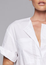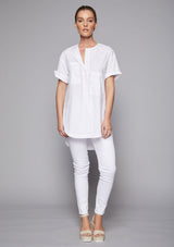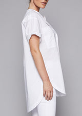 The Eclipse Top from Zoe Kratzmann features a round neckline with covered front centre buttons, short sleeves and oversized patch pockets that add a utilitarian flavour to this fresh and polished piece. The side scooped high/ low hemline makes it a flattering choice to pair with straight-leg pants. A working week and off duty essential that adds unquestionable style.