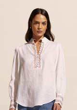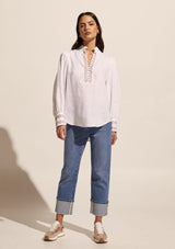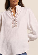 The Emerge Top from Zoe Kratzmann blends luxe details to create a timeless forever piece. It features a high neckline with delicate covered button through opening, blouson full sleeves with cuffs and a slightly curved hi/ low hemline. Elevated detail such as embroidery and lace trim create a feminine style. It blends a chic polished look with a free-spirited feel making it the ideal choice for everyday wear.