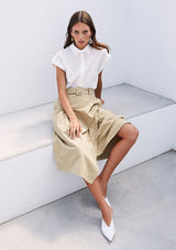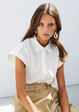 The Faction Top from Zoe Kratzmann features a modern shaped silhouette with pointed collar, covered buttons and wide cap sleeve design. This Top has been crafted from 100% Cotton, a non-stretch fabrication.