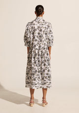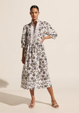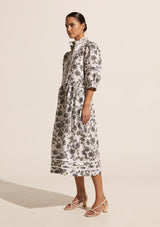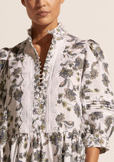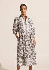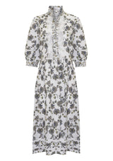 The Fairway Dress from Zoe Kratzmann features a high collar with a delicate covered buttons to the bust, lace detail, dramatic ¾ length cuffed blouson sleeves, gathering at waistline and pintuck detail at hemline. Elevated detail such as pintucks, embroidery and lace trim create a feminine style. This mid length dress is perfect for the new season and your go to for spring dressing.