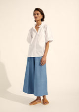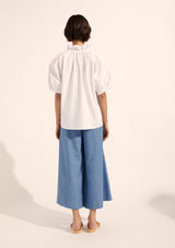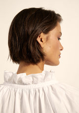 The Foster Top from Zoe Kratzmann features a softly ruffled mandarin collar with button opening and dramatic billowing sleeves. Fresh porcelain poplin brings an elevated element to a timeless shirt.