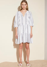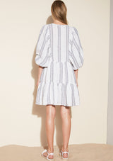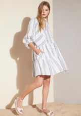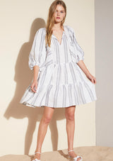 The Glee Dress from Zoe Kratzmann features blouson 3/4 sleeve, pockets and a tiered skirt. The neckline has a front neck slice with drawcord to alternate styling. Crafted from Ramie, a non-stretch fabrication.