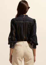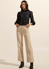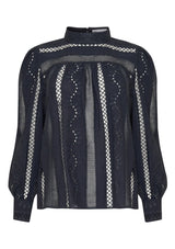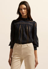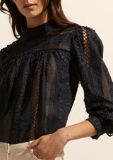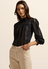 The Glimpse Top from Zoe Kratzmann features a high neckline with rear fastening and subtle blouson full length sleeves with cuffs. It contrasts bold scalloped details with delicate sheer sections and small 3d leaves for an on-trend yet feminine edge. Crafted in a custom Cotton broderie with 3d detailing, this top is equal parts modest and playful.