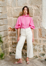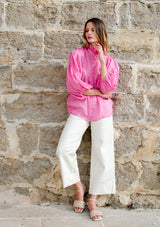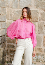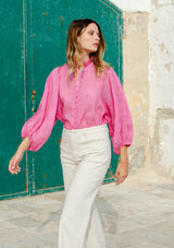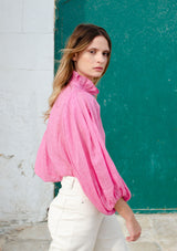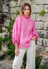 The Grant Top from Zoe Kratzmann features an elegant ruffled collar, button through opening with covered buttons and a dramatic blouson sleeve with an elasticated edge finish. Crafted in a lightweight, cross-dye ramie, this elegant top fuses the best of modern and romantic details with feminine finesse.