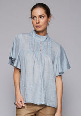 The Limbo Top from Zoe Kratzmann features a high neckline with button fastening at the back, short flouncy sleeves and a yoke with elevated detail such as pintucks and lace trim which create a feminine style. The slight A-line shape makes this top effortless yet flattering.