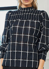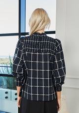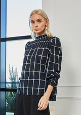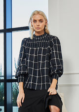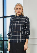 A contemporary white shirt that is both distinguished and youthful. Cut in crisp poplin the muse has beautiful shirring detail at the neck and sleeve and full length blouson sleeve. A slight A-line shape makes this top effortless yet flattering.