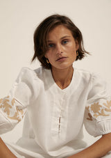The Nestle Top from Zoe Kratzmann features an open tab neckline with delicate covered front centre buttons and ¾ blouson sleeves. Elevated detail such as floral motif embroidery lends a touch of femininity. A soft shade of cream is complemented with caramel-hued motifs that adorn the billowing sleeves. A relaxed fit and lightweight linen cut a cool and comfortable line making it the ideal choice for everyday wear.