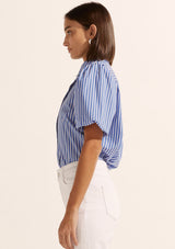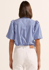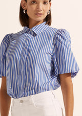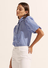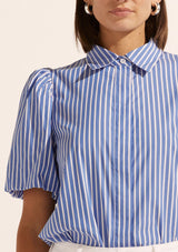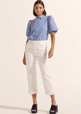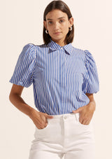 The perch top features a covered button placket, neat collar and short blouson sleeve. It offers a feminine yet refined take on the classic button-down shirt. Crafted in cotton poplin this style offers a little drama to your summer wardrobe.
