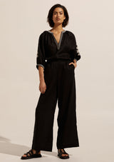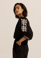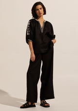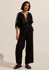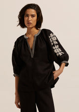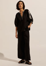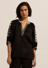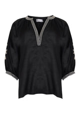 The Solitude Top from Zoe Kratzmann features a crew neckline and V-neck opening with a hidden button for a varied neckline and ¾ blouson cuffed sleeves. Stripe embroidery on the neckline and cuffs and folk inspired embroidery on the sleeves offer a bold, yet bohemian design. This stunning top is crafted from 100% Linen and is the perfect solution for elevated spring dressing.