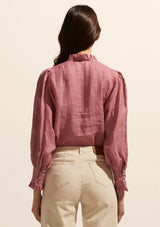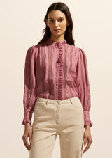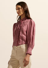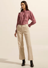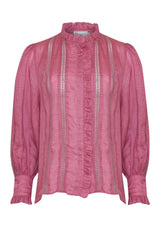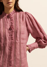 The Swoon Top from Zoe Kratzmann features a high neckline, ruffle detailing and subtle blouson full length sleeves with cuffs. It contrasts ladder lace trim with delicate sheer sections for a romantic and artisanal option that has feminine details at its core. Crafted in a quality cross-dye ramie, this top is the perfect relaxed yet distinctly feminine choice for the season.