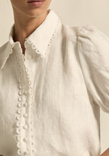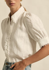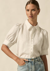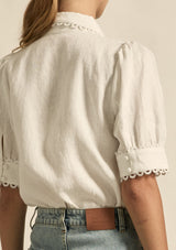 The Tether top by Zoe Kratzmann is detailed with scalloped lace and classic tailoring. A style that transitions seamlessly between day and evening.