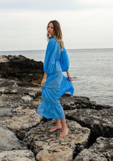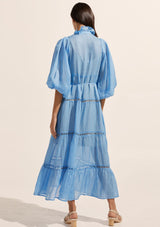 The Toast Dress from Zoe Kratzmann features an elegant ruffled collar, covered buttons that run the length of the garment, oversized blouson sleeves finished with an elasticated edge, dramatic tiered layers with punctuated with circular lace trim and a removable fine self-tie fabric belt. Crafted in a luxurious lightweight ramie fabrication, this piece is the perfect solution for balmy summer soirees and celebrations of the season.