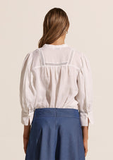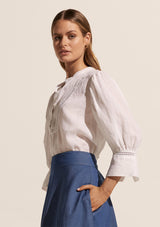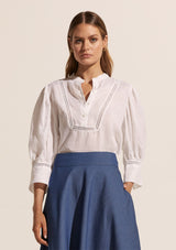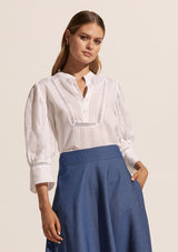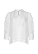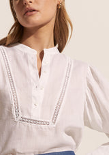 The Traverse Top from Zoe Kratzmann blends luxe details to create a timeless forever piece. It features a high round neckline with front centre buttons to the bust, ¾ length cuffed blouson sleeves and a relaxed fit which is effortless and flattering. Elevated detail such as embroidery create a feminine style. It blends a chic polished look with a free-spirited feel making it the ideal choice for everyday wear.
