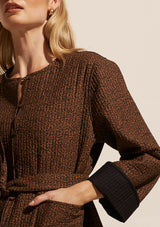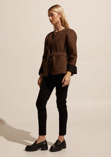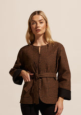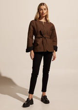 The Trill Jacket from Zoe Kratzmann is a classic jacket that is perfect for spring dressing. It features a round neckline, single front opening, removable belt, full length wide sleeves, front patch pockets and a slightly curved hemline.