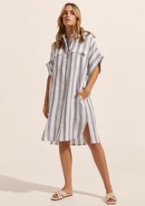The Troppo Dress from Zoe Kratzmann features a classic collar, front placket with concealed button fastening, oversized patch pockets, side pockets, generous short sleeves and a slightly curved hem with side splits. Crafted in a lightweight linen fabrication, this dress is the perfect bridge between a casual coverup and a contemporary shirt dress.
