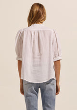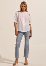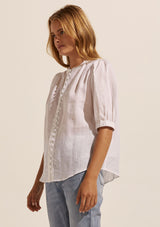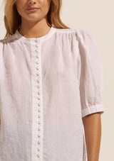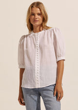 The Virtue Top from Zoe Kratzmann features a high round neckline with button through opening, back yoke with slight gathering and short blouson sleeves with elasticated cuffs at elbow. Crafted in a natural Ramie fabric, this lightweight top is a culmination of elevated feminine style and simplicity.