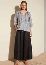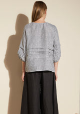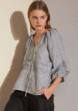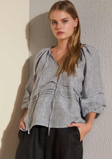 The Voyage Top from Zoe Kratzmann features classic peasant style shirt with pintucks and a blouson 3/4 sleeve. The neckline has a front neck slice with drawcord to alternate styling. Crafted from Ramie, a non-stretch fabrication.