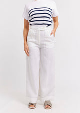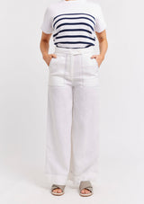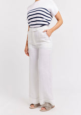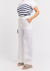 The Clio Pant from Alessandra features a flat waistband, button closure with hidden zip, patch pockets and wide leg silhouette with a deep hem. Contrast stitching detail on the pockets and hemline creates a casual style. This pant is crafted from 100% linen, a non-stretch fabrication that is breathable and ideal for everyday wear.