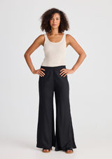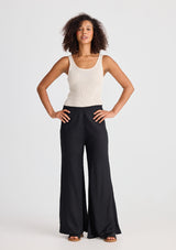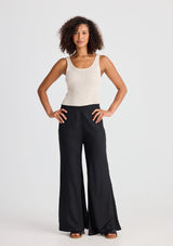 The Sicily Pant by Shanty is crafted by a Linen and cotton blend. This pant features a midrise, full length flared wide leg and an elasticated waist band.