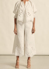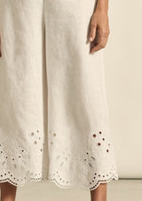 The Apprise Pant by Zoe Kratzmann is embroidered with a delicate floral motif and finished with a scalloped hem.