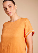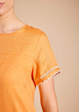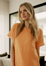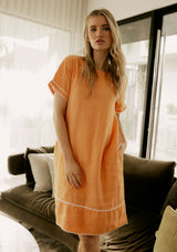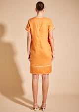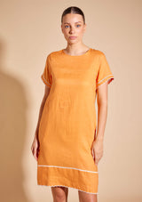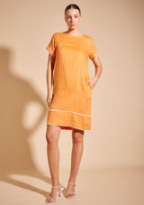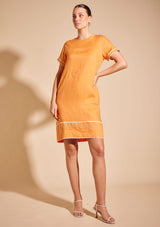 The Odette Dress from Alessandra features a crew neckline, exposed gold back zip opening, short sleeves, side pockets, a deep hem and scalloped edges with contrast coloured trim detail. This knee length shift dress is crafted from 100% Linen; a non-stretch fabrication that is breathable and ideal for everyday wear.