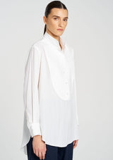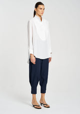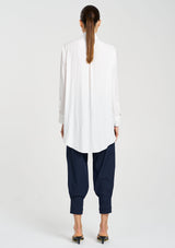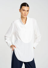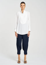 The Dinner Shirt features a flattering & versatile trans-seasonal piece with button closure through the collar. Crafted from Mela Purdie's Mache, featuring a fitted silhouette with fluidity and airflow finish.