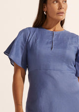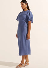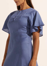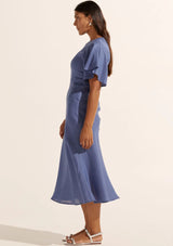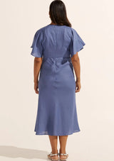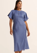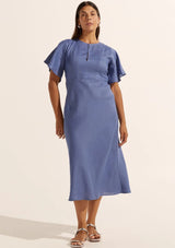 The Pavillion dress with its flutter sleeves and bias cut skirt the pavilion transitions effortlessly from beachside brunches to elegant evening soirees. This piece offers a clean and contemporary aesthetic but is also a fresh and feminine choice. Fitted with a hidden hook and eye fastenings give options to open up the neckline.