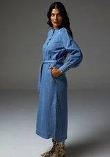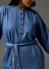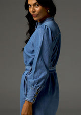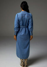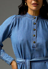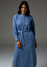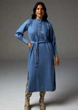 Inspired by vintage denim styles, the Snapshot Dress brings classic tailoring to the forefront with its midi length and self-tie belt. Side splits and a scooped hemline are considered elements. Domed brass buttons, double topstitching, and a drapey cotton-lyocell blend make it a standout denim piece
