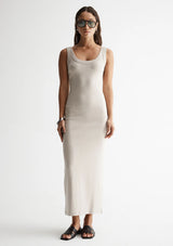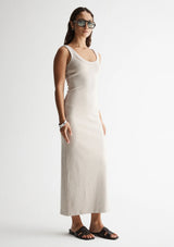 The Sienna Tank Dress from Elka Collective is a timeless addition to any wardrobe. Crafted from an organic cotton blend, this sleeveless dress features a low scooped neck and a comfortable straight fit. With its versatile design, it can easily be dressed up for special occasions or worn casually for everyday wear.