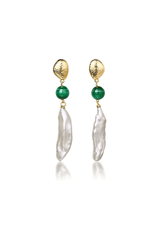 The Dig It Earrings by F+H feature a Gold-Plated Stud design with suspended Malachite, and a freshwater pearl for an elegant, yet contrasting effect.