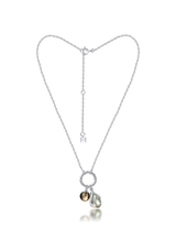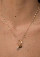 The Right On Necklace from F+H features a freshwater pearl and gemstone charms, on a snakeskin hoop and square link chain.