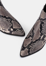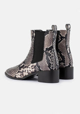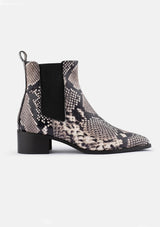 DOF Studios Carina Boot is a timeless classic crafted with premium materials that feature a fashion-forward snake print embossed leather. Exquisitely detailed, the minimal design provides multiple styling options to make modern looks with a sophistication that will last through the years.