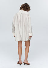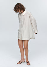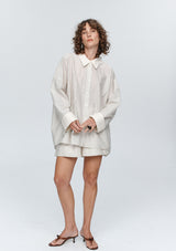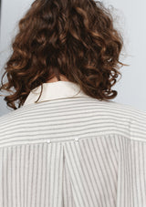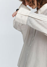 The Edie Shirt features a standard collar, secured with shell buttons down the centre front. This shirt has an oversized and boxy fit with an A-line silhouette through the body, falling slightly longer at the back. This shirt has wide, long sleeves, finished with two shell buttons at the cuff. This version is crafted in a lightweight cotton silk cloth with a black base and dark beige stripe. This fabric has a subtle sheerness
