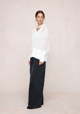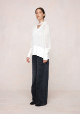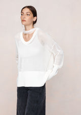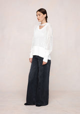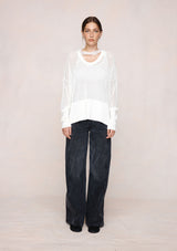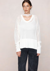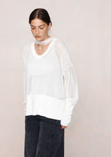 The Hope Jumper by Marle is a lightweight open-knit jumper designed to fall with an easy drape, finished with a wide ribbed hem and cuffs for subtle structure. The scoop neckline and softly dropped shoulders create a relaxed yet refined shape, ideal for layering. Semi-sheer in finish, the Hope Jumper adds quiet dimension and is paired with a 100% silk scarf, offering versatile styling options.