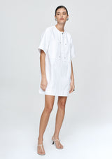 The Patch Pocket Dress by Marle is a short-sleeve dress constructed from 100% organic cotton with a relaxed, boxy shape. Featuring a round neckline, a concealed half placket secured with snap dome closures, two oversized chest patch pockets with metal rivet reinforcement. Finished with topstitching and exaggerated hem detailing for a utility-inspired finish.