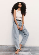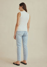 The Straight Leg Jean by Marle features a high rise fit with the classic five pocket styling, a shank button, zipper fly and slim leg silhouette in a light indigo wash.