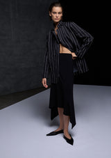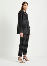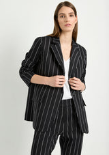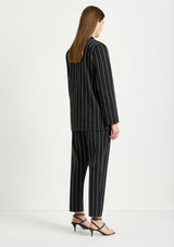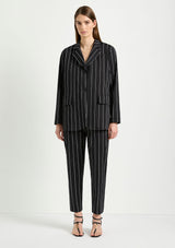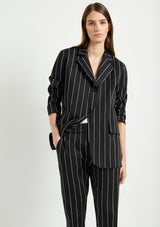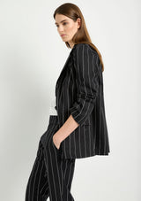 The Stretch Blazer from Mela Purdie features a classic lapel, single breasted front with button closure, full length sleeves and welted pocket detail. Designed for a relaxed tailored fit, this Blazer is crafted from Mela's Pin Popilene Stripe fabrication; a structured, stretchy, cotton-rich blend with a polished finish.