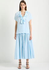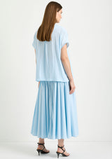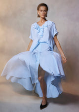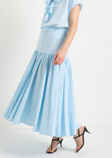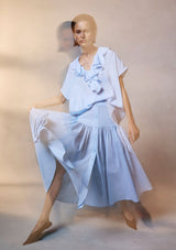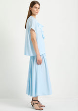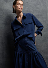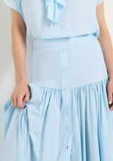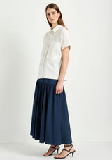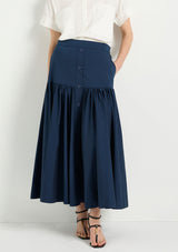 The Meridian Skirt from Mela Purdie features an A-line silhouette, flat waistband with elastic at back, drop yoke with soft gathering and a button through front opening. This feminine skirt is crafted from Mela's best-selling Microprene; a lightweight polished cotton stretch fabrication that is machine washable.