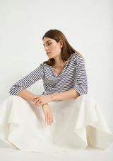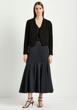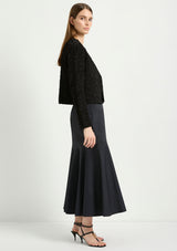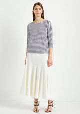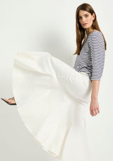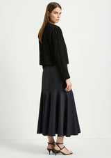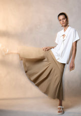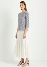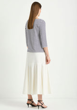 The Bell Skirt from Mela Purdie features an elasticised waist and a form fit through the hips, panelled details and a drop yoke with a flared silhouette. This mid length skirt is crafted from Mela's Stretch Chintz fabrication, a technical stretch weave. Cool to touch with a subtle sheen and polished finish, sitting off the body with a beautiful drape and organic movement.