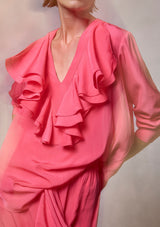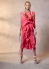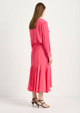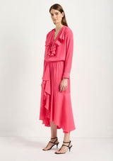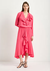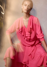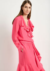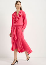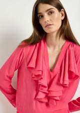 The Peak Blouse from Mela Purdie features a V neckline with frill detail, full-length sleeves with buttoned cuffs, back pleat detail and a curved hemline. Crafted from Mela’s non-stretch fabric, Mache, it offers a relaxed fluidity and smooth lustre surface, blending style and comfort in a user-friendly, machine washable fabric ideal for travel.