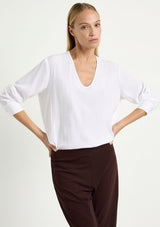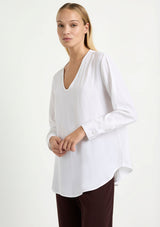 The Slide Blouse from Mela Purdie features a U-shaped neckline, full length sleeves with cuffs and a curved hemline. This versatile blouse is crafted from 100% technical polyester; Mache offers a full bodied, high fashion look combining style and comfort in a user-friendly fabrication that is machine washable and ideal for travel.