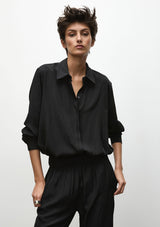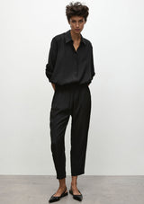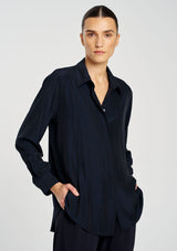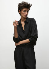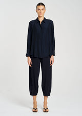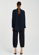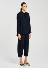 The Soft Shirt from Mela Purdie features a classic shirt collar, concealed front button closure, full length sleeves with cuffs and a back yoke with pleat detailing. Crafted from Mela’s non-stretch fabric, Mache, it offers a relaxed fluidity and smooth lustre surface, blending style and comfort in a user-friendly, machine washable fabric ideal for travel.