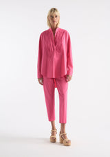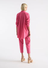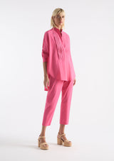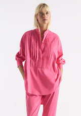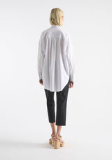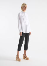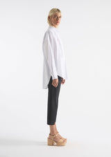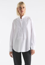 The Tux Shirt by Mela Purdie features a classic stand collar, pleated panelling across bust with a concealed button placket to waist, full length sleeves with buttoned shirt cuffs, back yoke with pleat detailing and a high/low curved hemline. This shirt is crafted from Mela's best-selling Microprene; a lightweight cotton stretch fabrication that is machine washable.